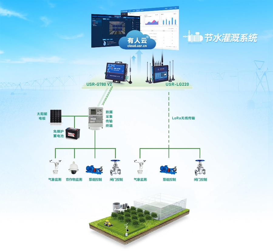 農(nóng)業(yè)節(jié)水灌溉系統(tǒng)主要由土壤水分傳感器、氣象監(jiān)測站、閥泵控制、視頻、采集控制終端、無線通訊模塊、光伏電源系統(tǒng)以及有人云農(nóng)業(yè)管理監(jiān)控平臺等組成。系統(tǒng)整合區(qū)域內(nèi)水文水情、氣象作物、工情等信息,實(shí)現(xiàn)了信息的采集、統(tǒng)計、分析、控制、調(diào)度等功能。為灌區(qū)管理部門提供科學(xué)決策依據(jù),提升灌區(qū)的管理效能,實(shí)現(xiàn)農(nóng)業(yè)灌溉自動化。